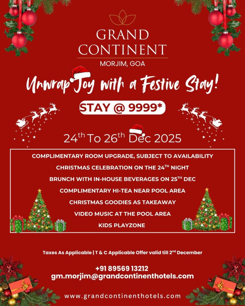 Grand Continent’s Christmas package for couples starts from INR 9999 per night (Deluxe) and includes a gala dinner, welcome drink, breakfast, hi-tea, festive treats and pool access — valid on 24th & 26th December 2025.